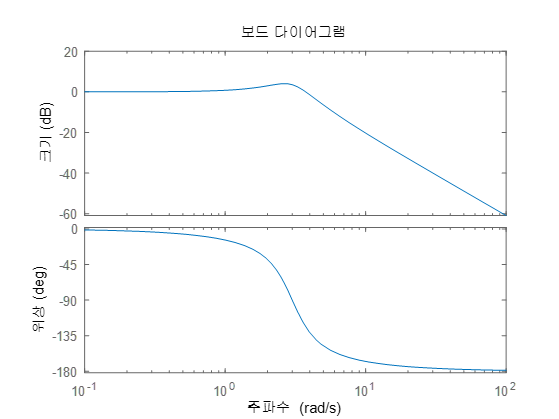 Equation 19. 앞서 살펴본 예제의 Transfer function을 MATLAB의 Bode 명령어를 통해 Bode plot을 구하면 Figure 6.과 같다.
