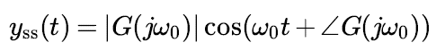 주파수 영역에서 하나의 Frequency를 줘서 시스템의 특성을 분석하는 방법이 Sinusoidal response이다. Sinusoidal response는 시스템의 입력 u(t)를 u(t)=cos(wt)나 u(t)=sin(wt)로 줬을 때의 출력 y(s)을 의미한다. Sinusoidal input을 Euler`s identity를 활용해 Exponential form으로 Equation 6.과 같은 형태를 표현하여 입력으로 넣어줄 수 있다.