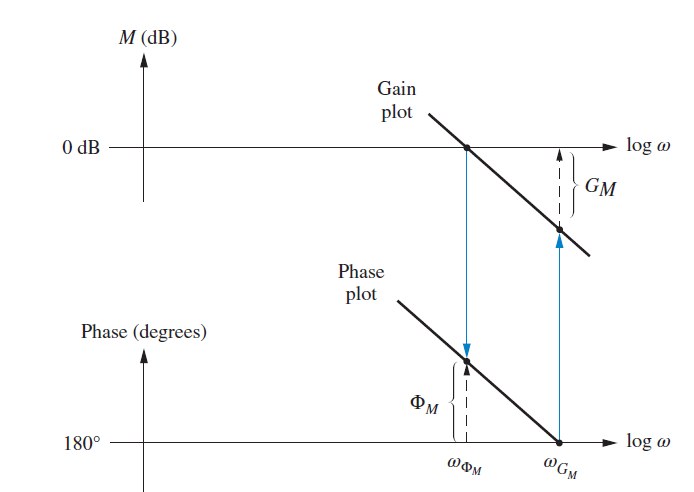 Figure 7. Gain Margin and Phase Margin from Bode plot Bode plot에서 Gain margin과 Phase margin은 Figure 7.처럼 정의된다.