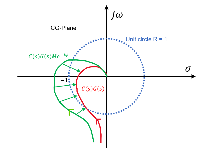 위처럼 Stability를 Nyquist plot에서 분석하는 이유는 Gain Margin과 Phase Margin을 정의하고 그 관계에서 Robustness가 판단되기 때문이다. 우선 Gain margin과 Phase margin의 정의는 Figure 4.로부터 나온 각각 Equation 5.와 Equation 6.과 같다. 해당 Plane은 Controller와 Model의 Transfer function인 C(s)G(s)의 Plane으로 Nyquist plot Stability 기준에 따라 두가지로 그려진다.